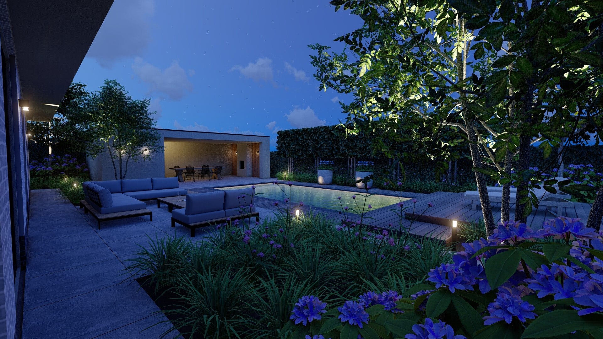 Transformeer uw tuin 's avonds met een uitgekiend verlichtingsplan. Van subtiele accenten tot functionele padverlichting, wij zorgen voor een magische sfeer en verhoogde veiligheid.